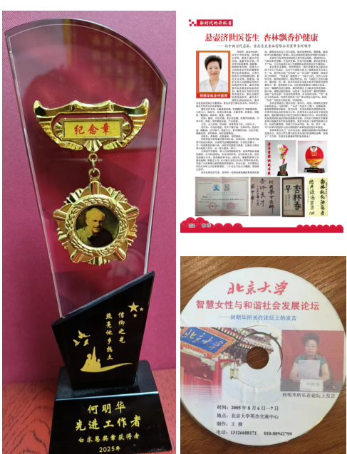 In 2024, He Minghua achieved remarkable accomplishments in both the medical field and public welfare. At the 7th CCTV Public Welfare Ceremony, she was awarded the title of National Model Public Welfare Figure. During the "7th China Physician Day" grand event, she was honored with the title of "Outstanding Traditional Chinese Medicine Practitioner." At the "7th" Public Welfare Ceremony, she was again awarded the title of "2023 Public Welfare Star" by CCTV. These honors not only represent high recognition of her medical expertise but also fully affirm her medical ethics and public welfare spirit.